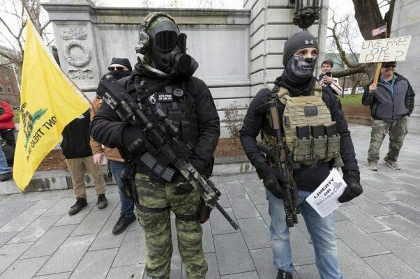 Một nhóm đàn ông mặc đồng phục kiểu quân đội, bịt mặt và cầm súng. Họ truyền đi thông điệp rằng kéo dài phong toả là không cần thiết vì bang này ghi nhận tương đối ít ca Covid-19.