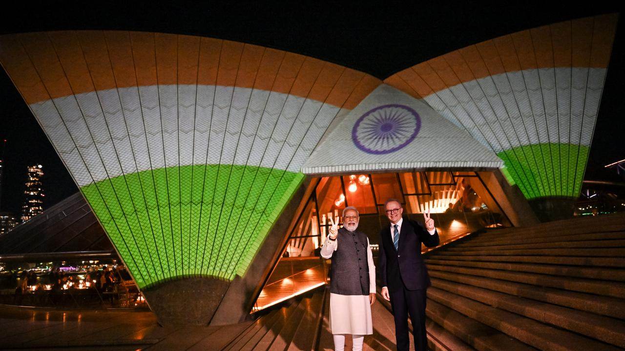 Ông Albanese và Thủ tướng Ấn Độ Narendra Modi đứng trước Nhà hát lớn khi những cánh buồm được thắp sáng.